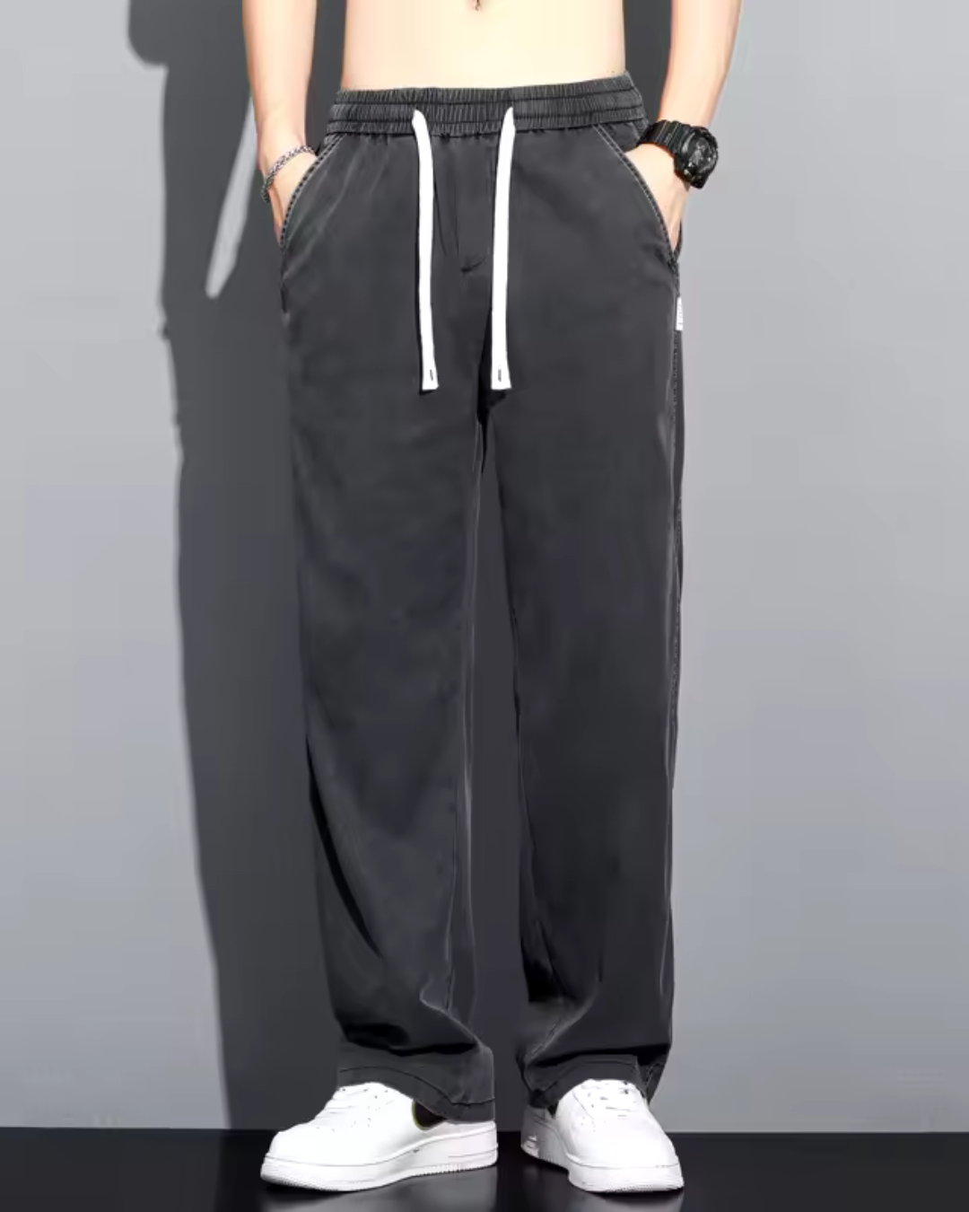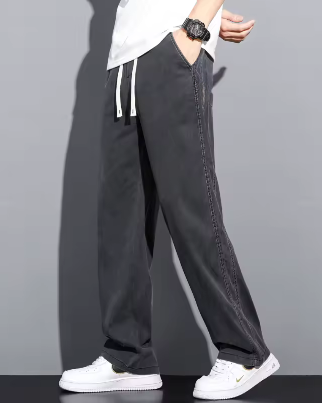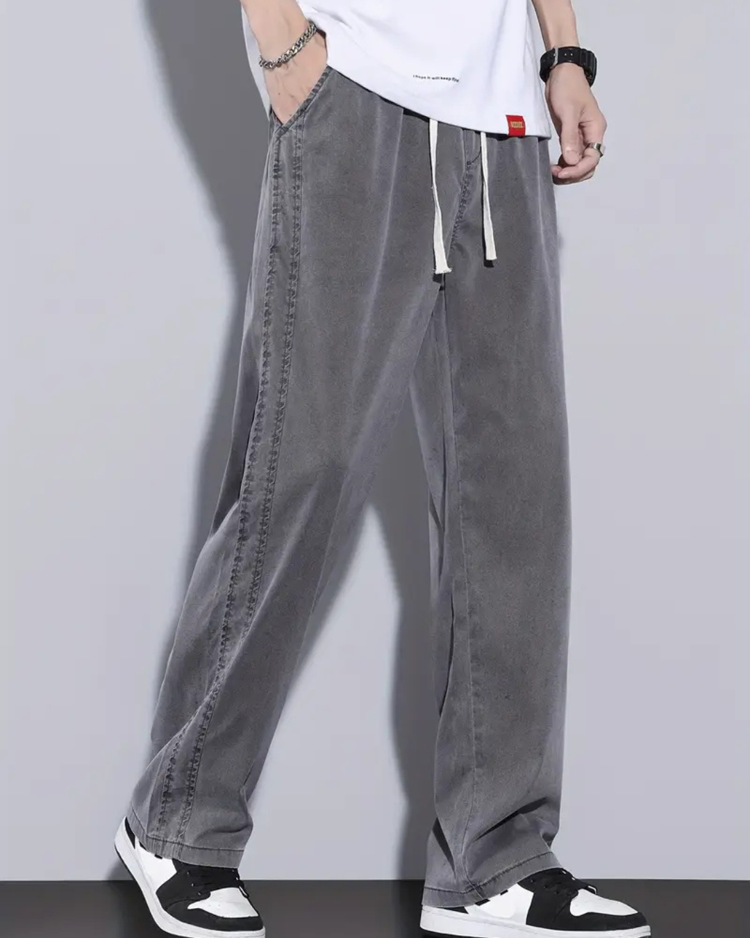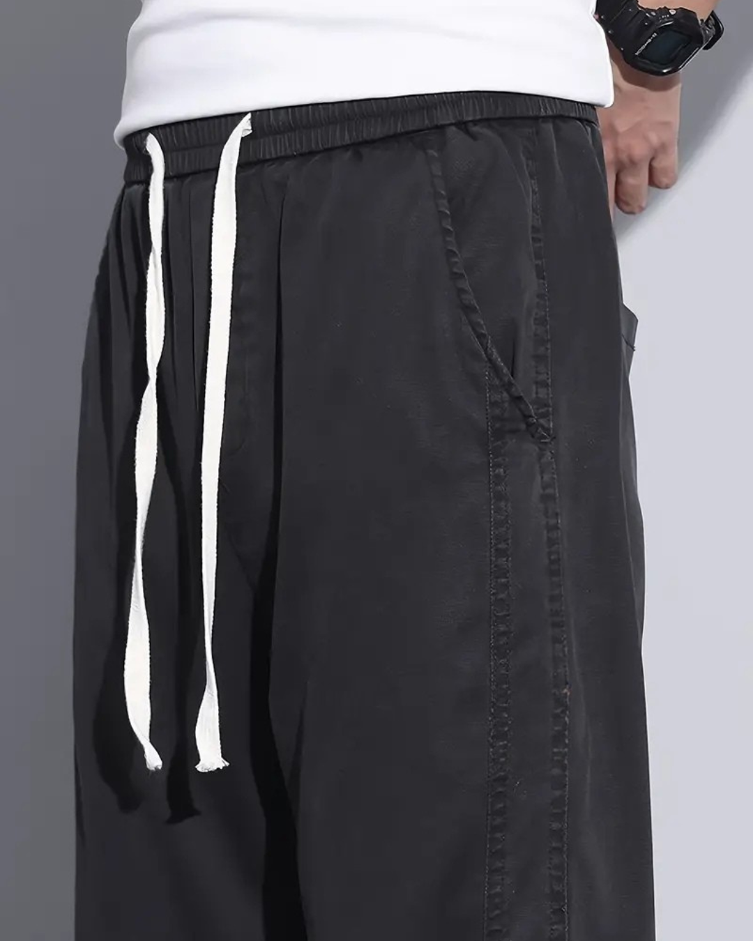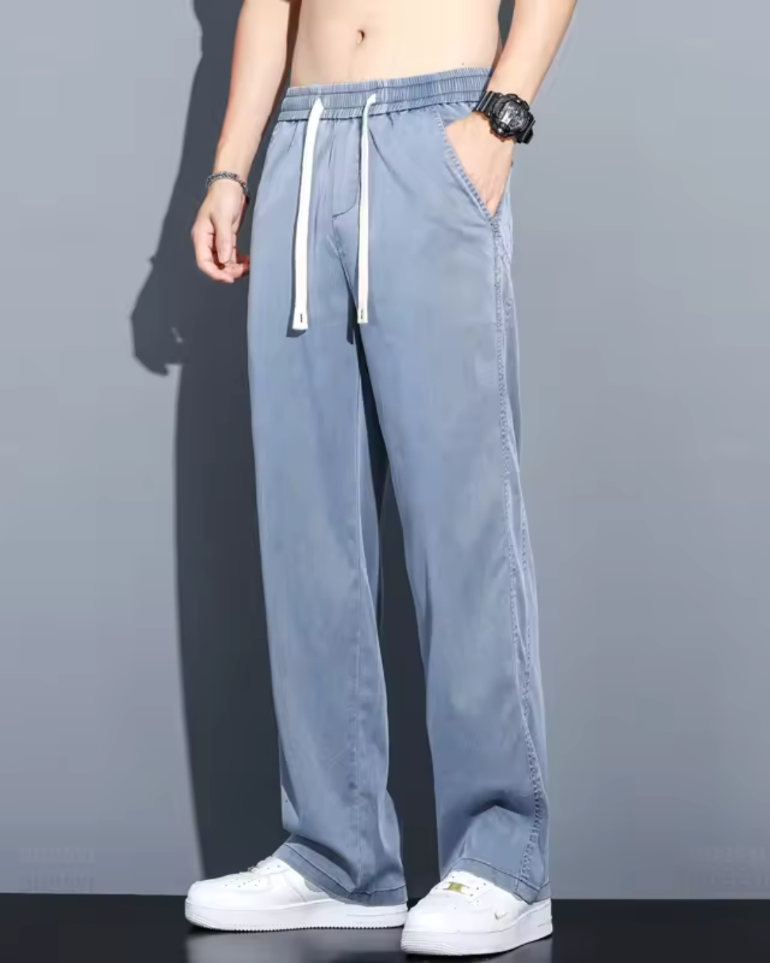 Estas calças são confeccionadas em tecido suave e respirável que proporciona frescura nos dias mais quentes. O seu design de perna larga e cintura ajustável garante conforto e liberdade de movimentos.