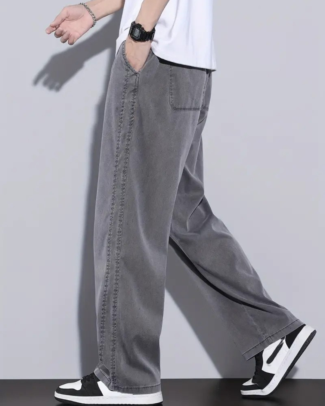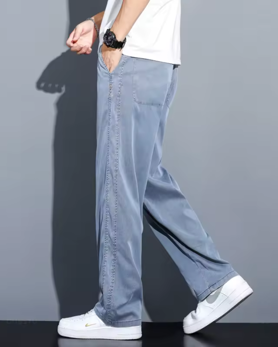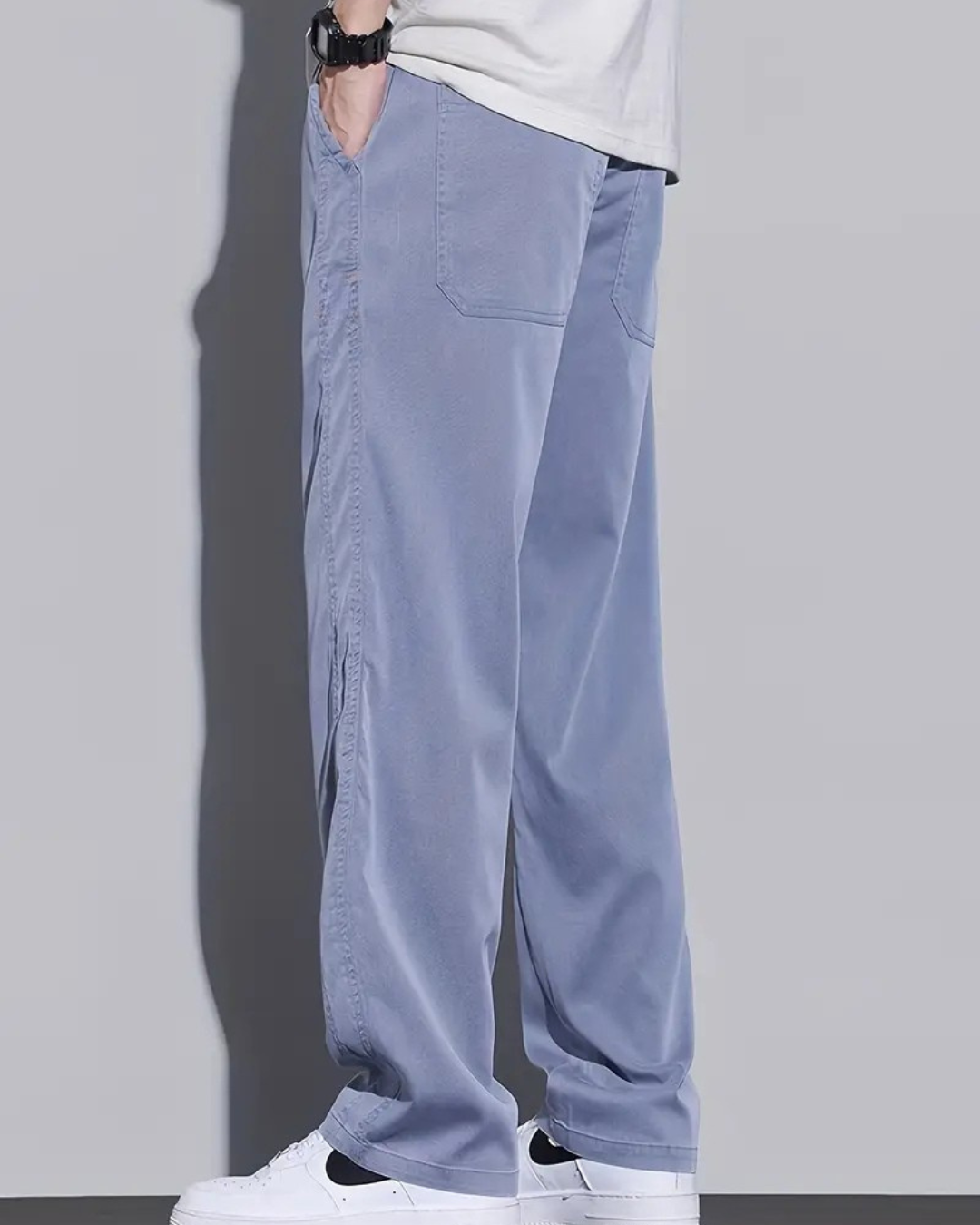 Concebido com um corte largo e perna larga que proporcionam liberdade ao caminhar. O tecido respirável garante frescura mesmo em dias quentes. Um básico indispensável para conseguir um look casual e moderno.