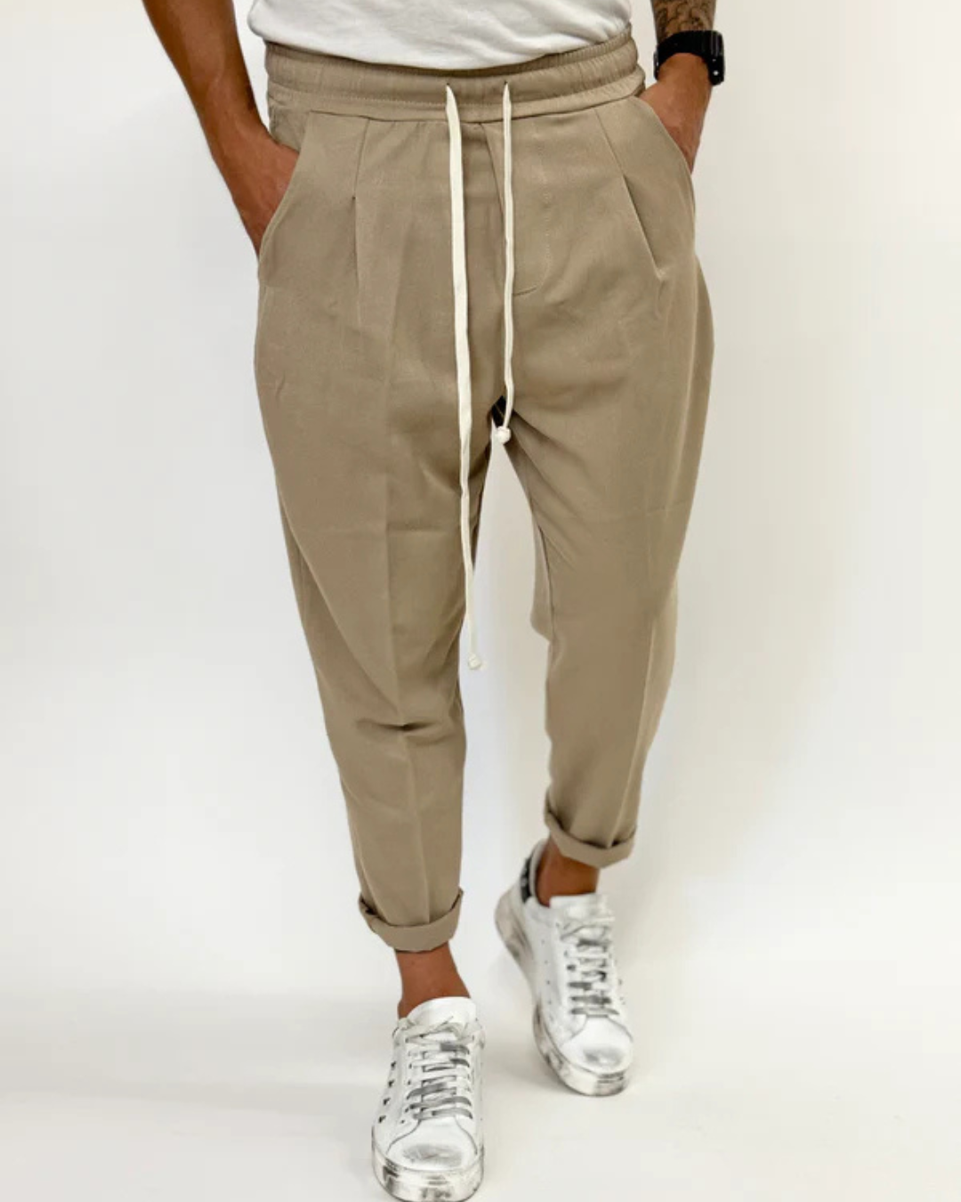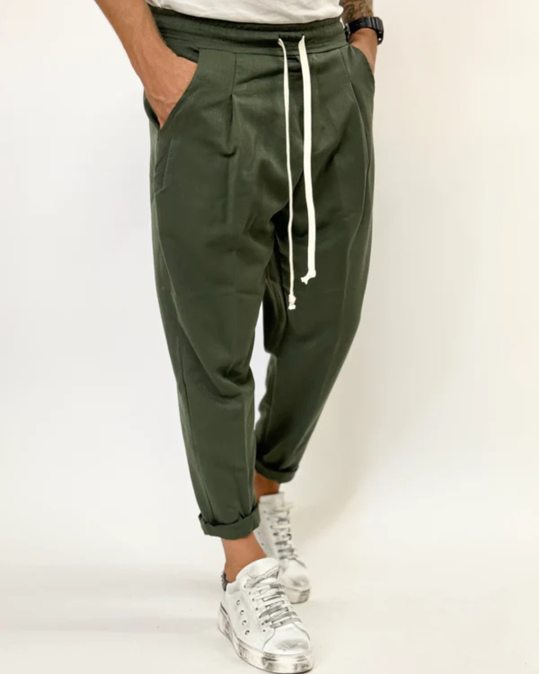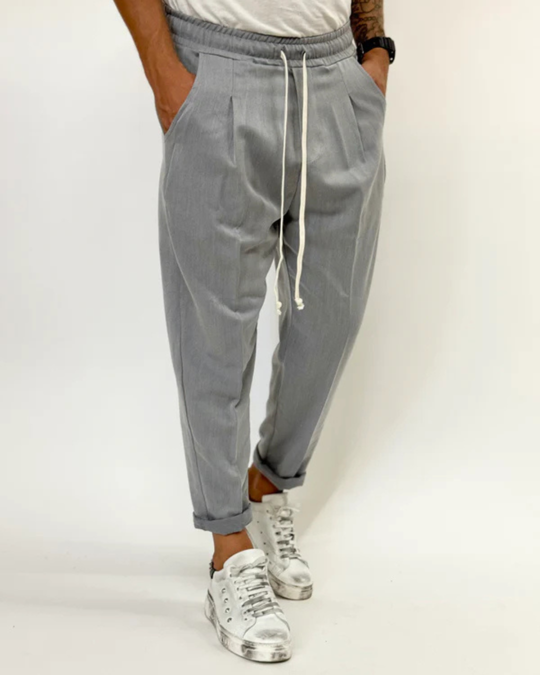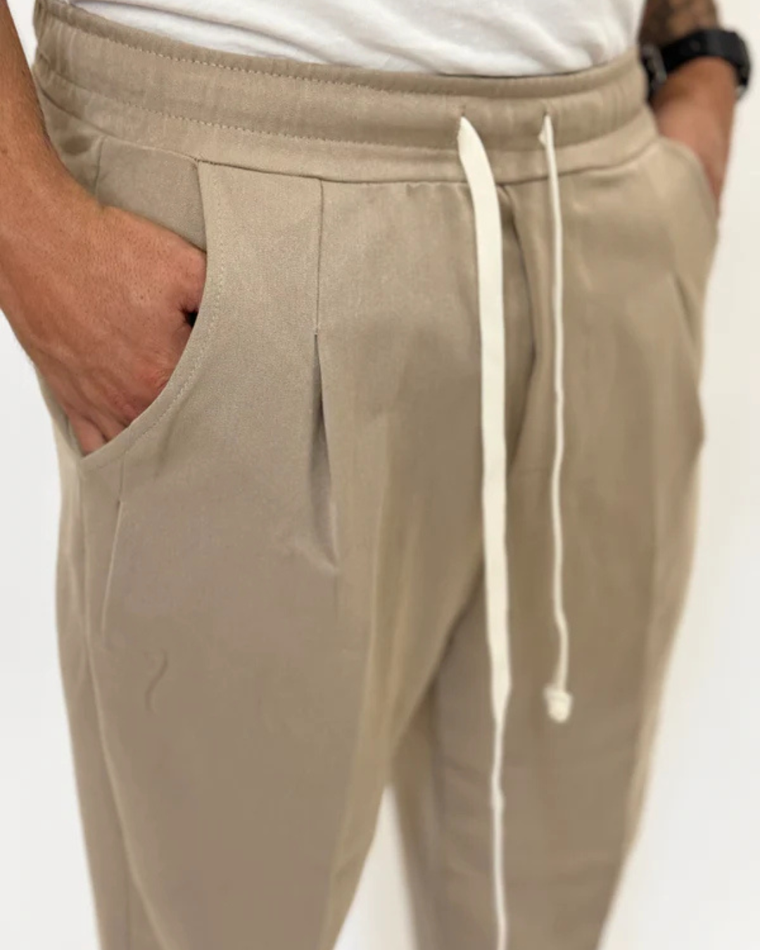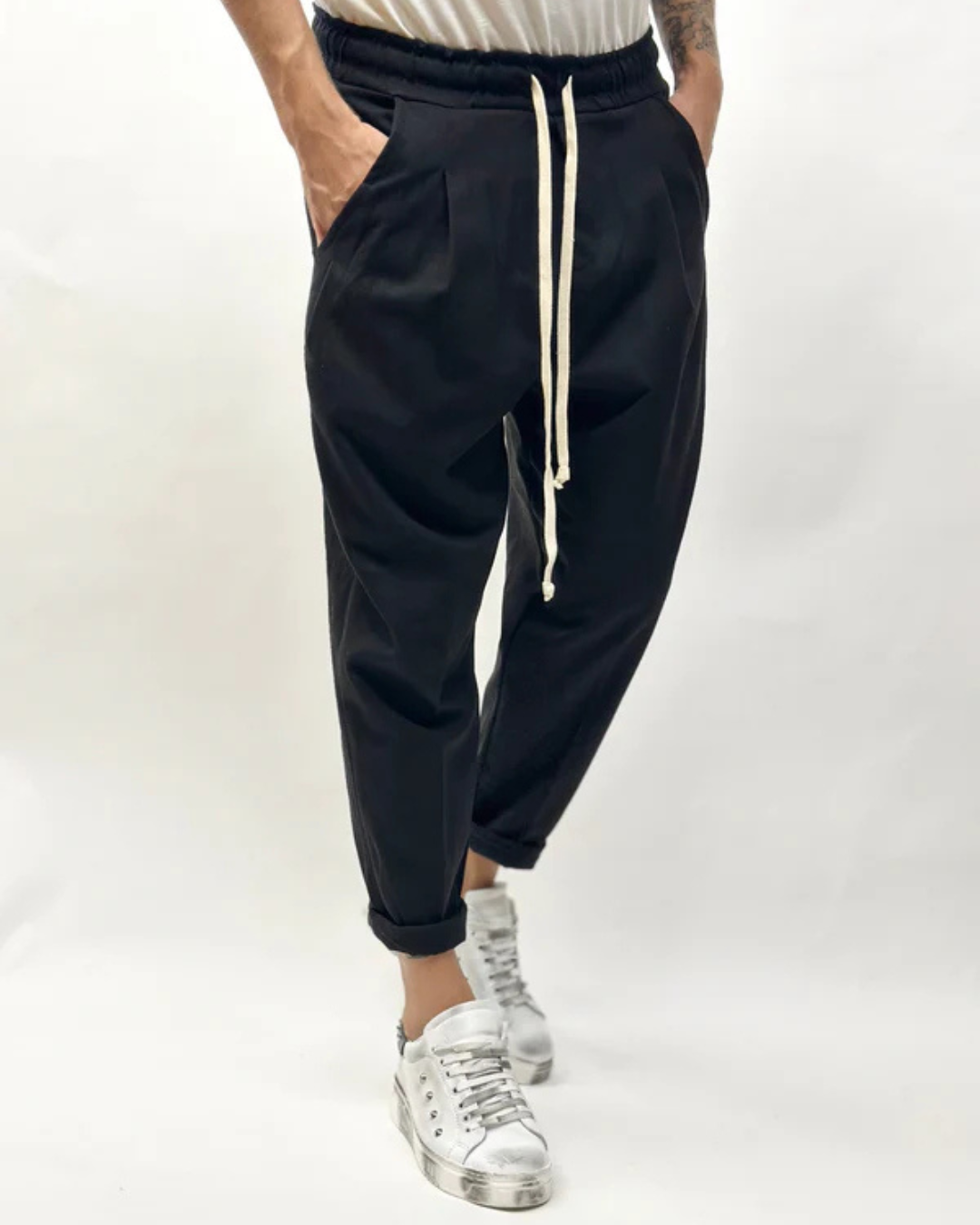 Com acabamentos cuidadosos e cintura ajustável, estas calças unem funcionalidade e sofisticação. Um essencial moderno para o guarda-roupa masculino.