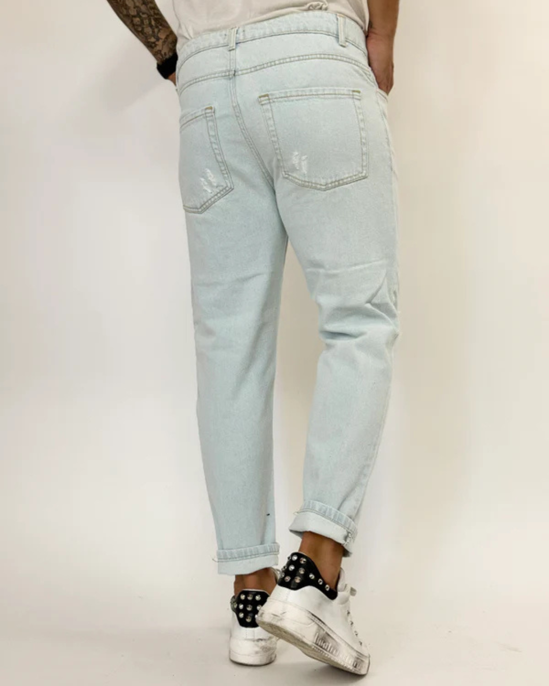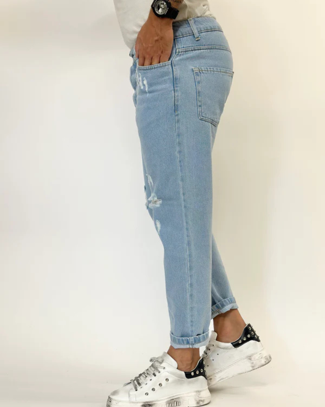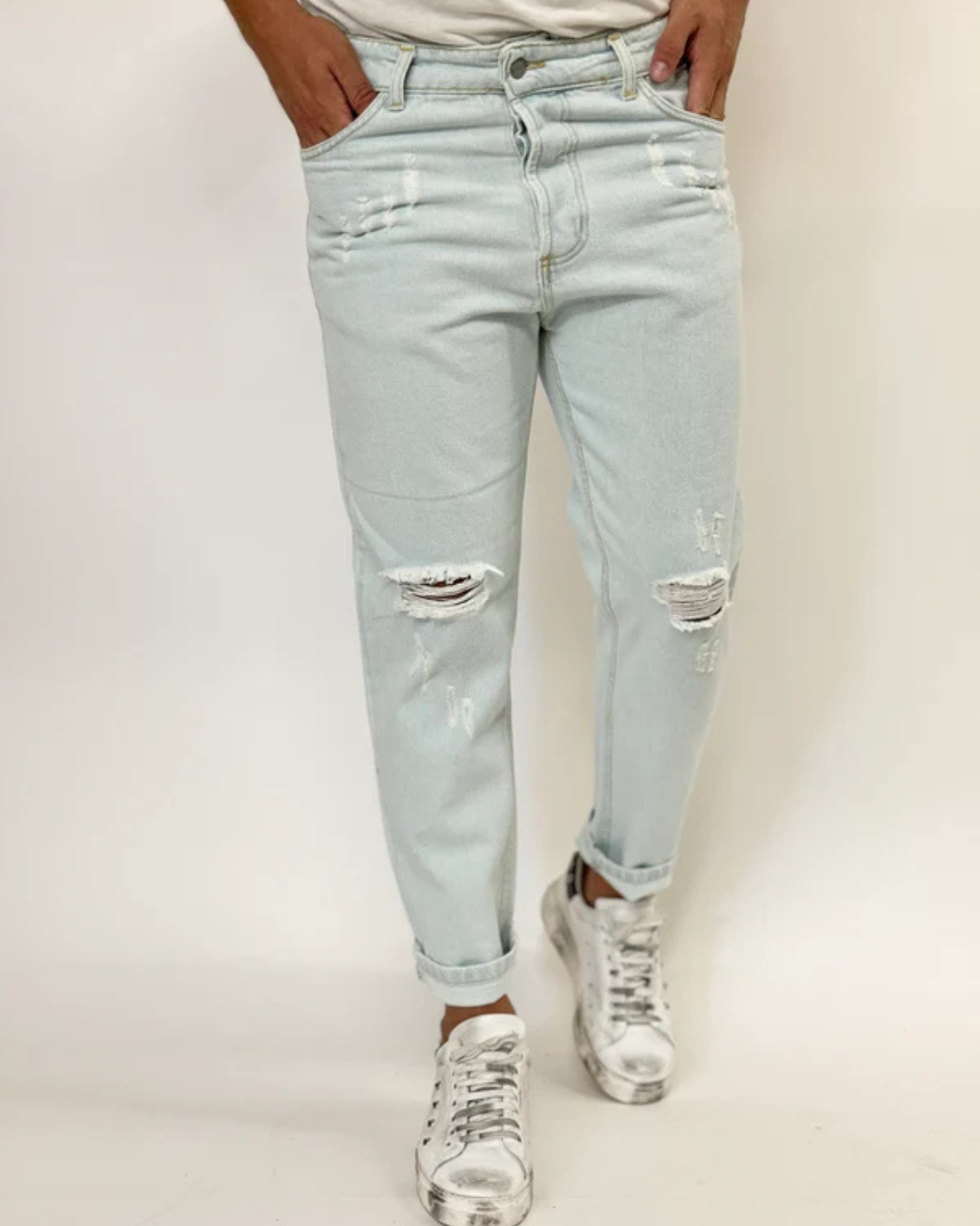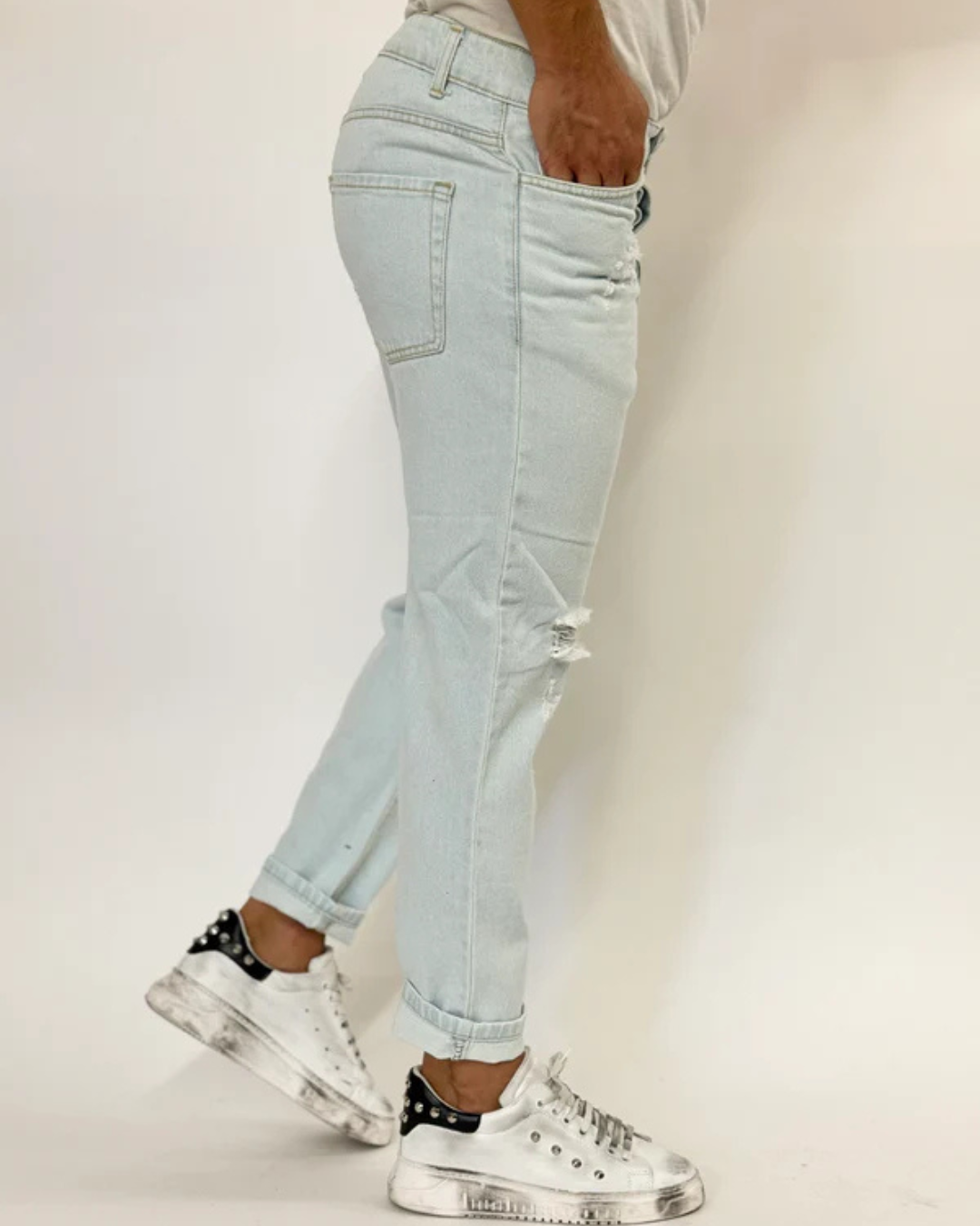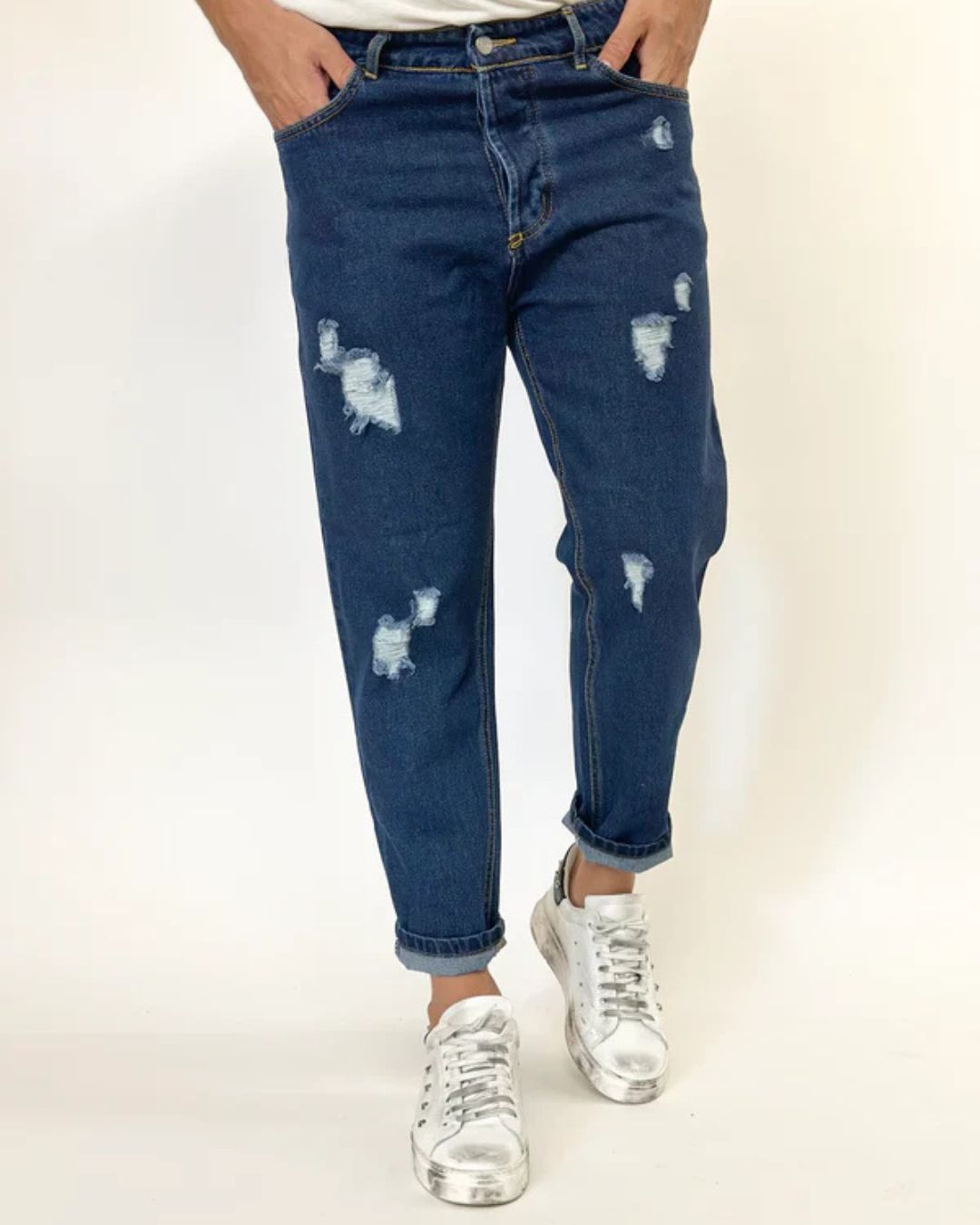 O rasgão no joelho adiciona um toque sutil de irreverência, ideal para quem busca um estilo urbano sofisticado.