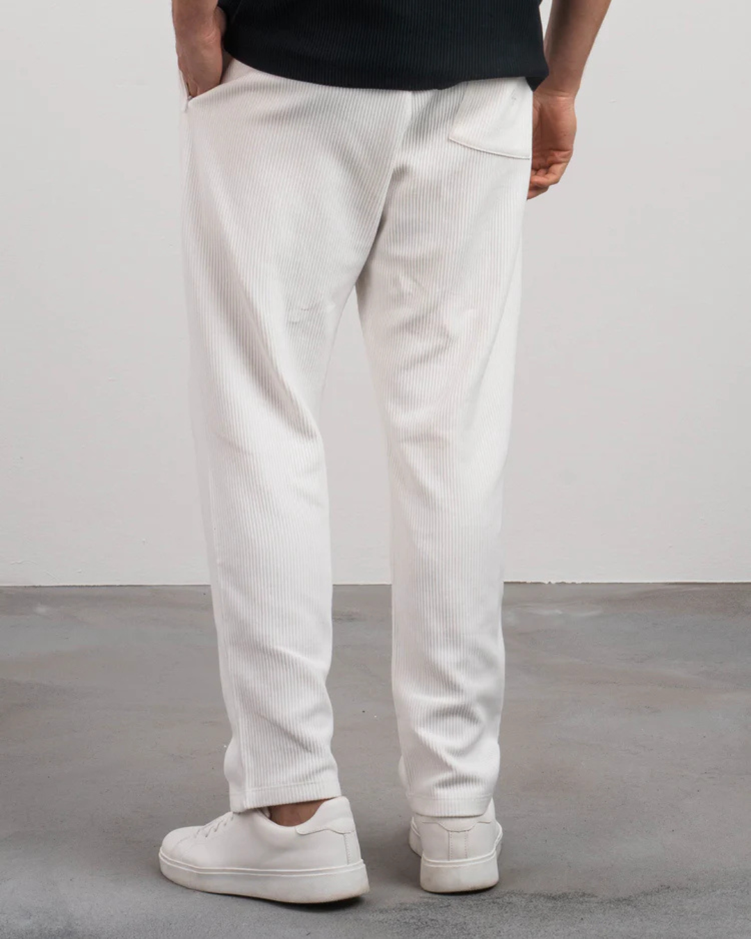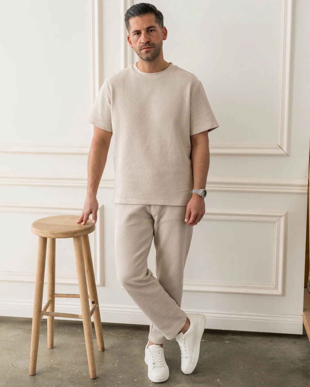 Um conjunto monocromático em bege com uma textura canelada que eleva o casual ao elegante. Perfeito para o dia a dia com um toque de distinção.