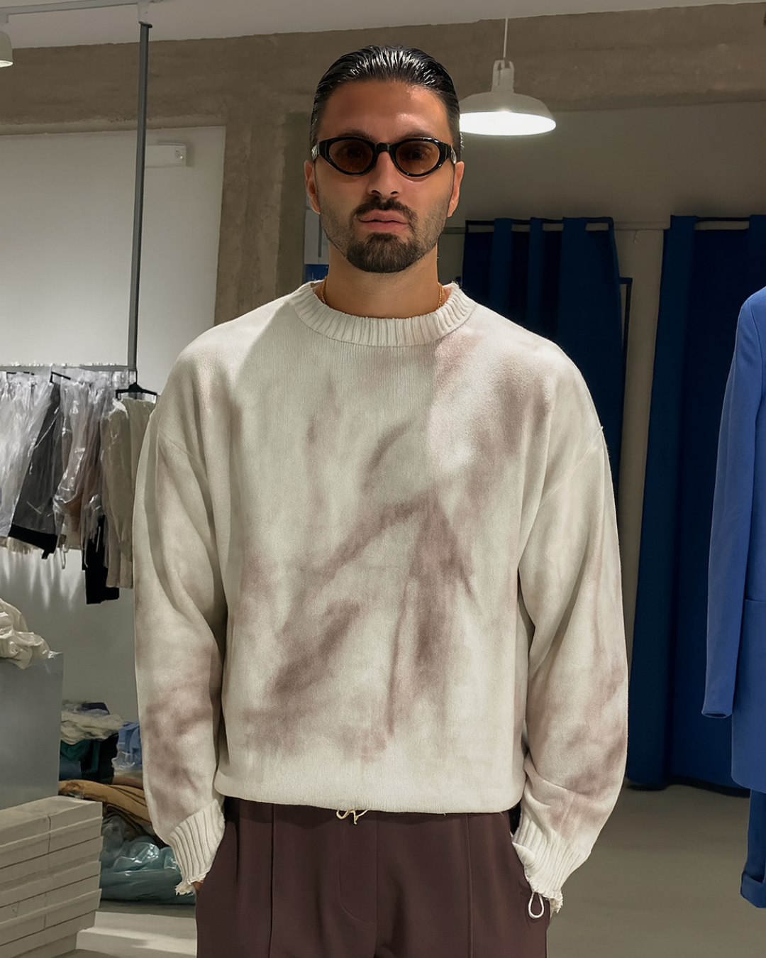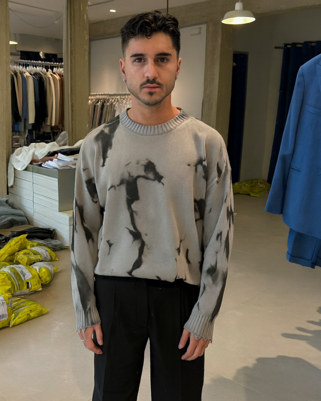 A camisola apresenta um padrão que parece uma combinação de tingimento ou lavagem, criando um efeito visual intrigante e abstrato. Este design único diferencia-a das camisolas básicas, oferecendo um toque de arte e modernidade em cada peça.