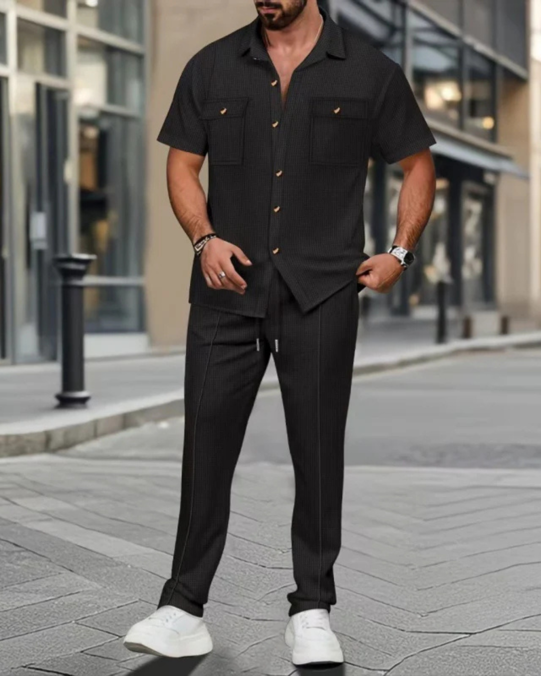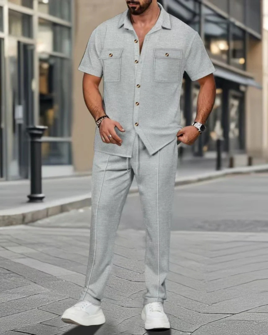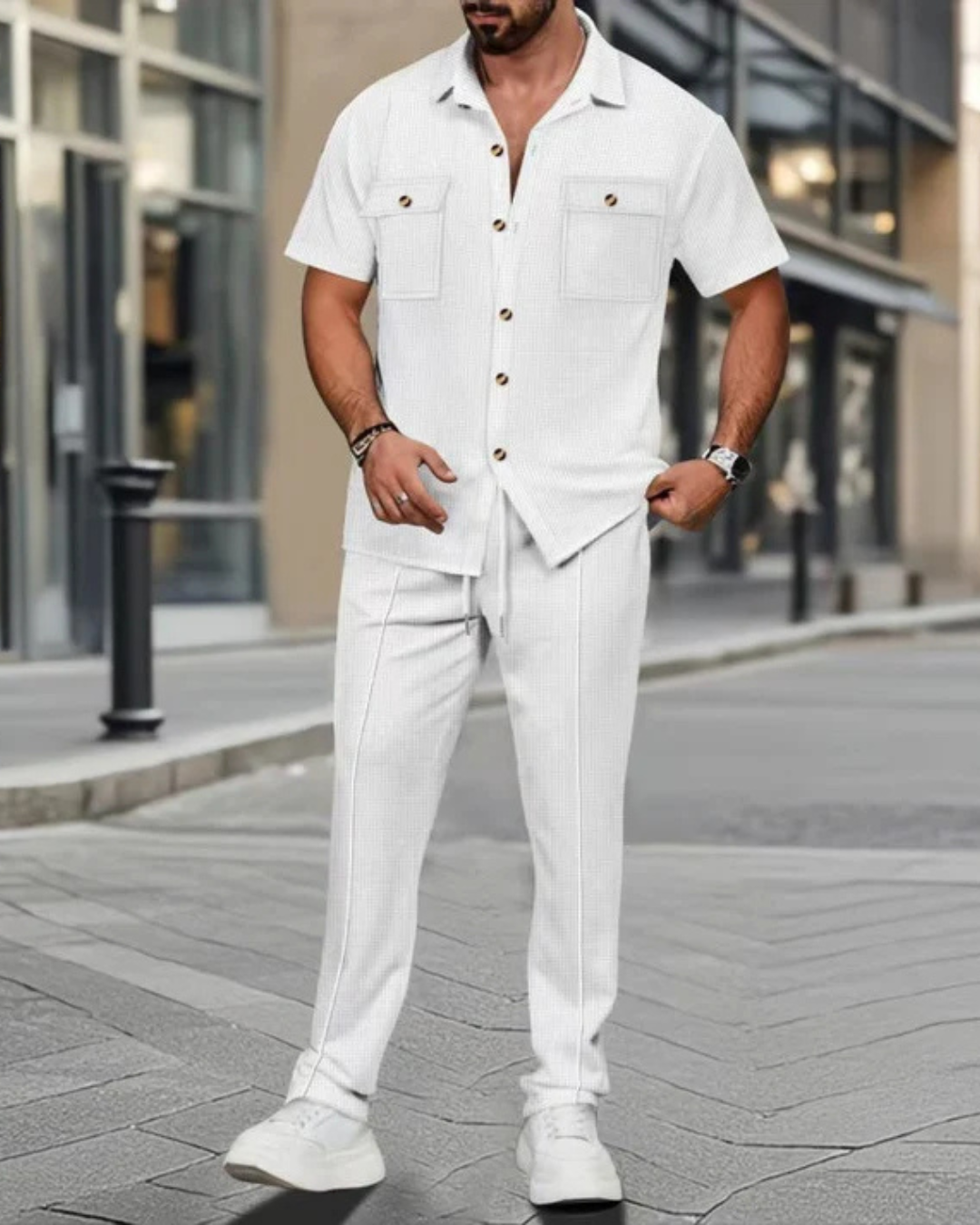 Leve, fresco e fácil de combinar, este conjunto foi concebido para quem valoriza a moda sem sacrificar o conforto. O seu estilo intemporal torna-o uma peça essencial para os dias quentes.