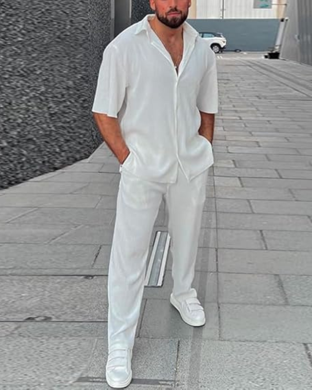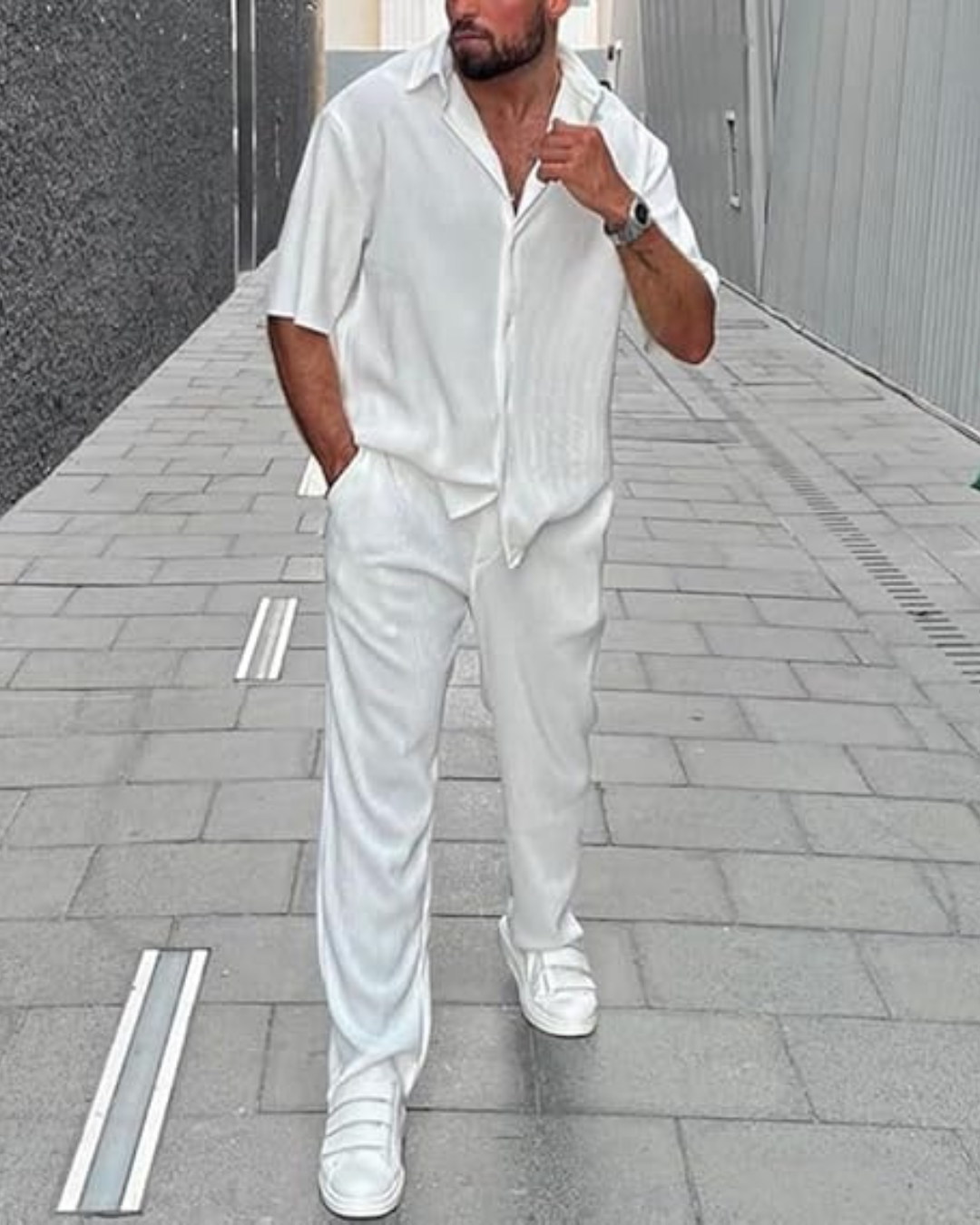 Conjunto de duas peças com camisa de manga curta e acabamento texturado, ideal para um look fresco, moderno e sem esforço.
