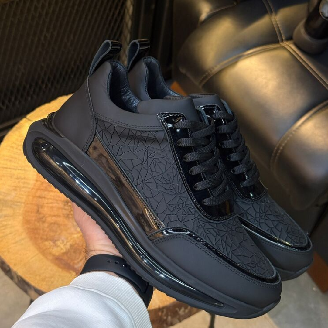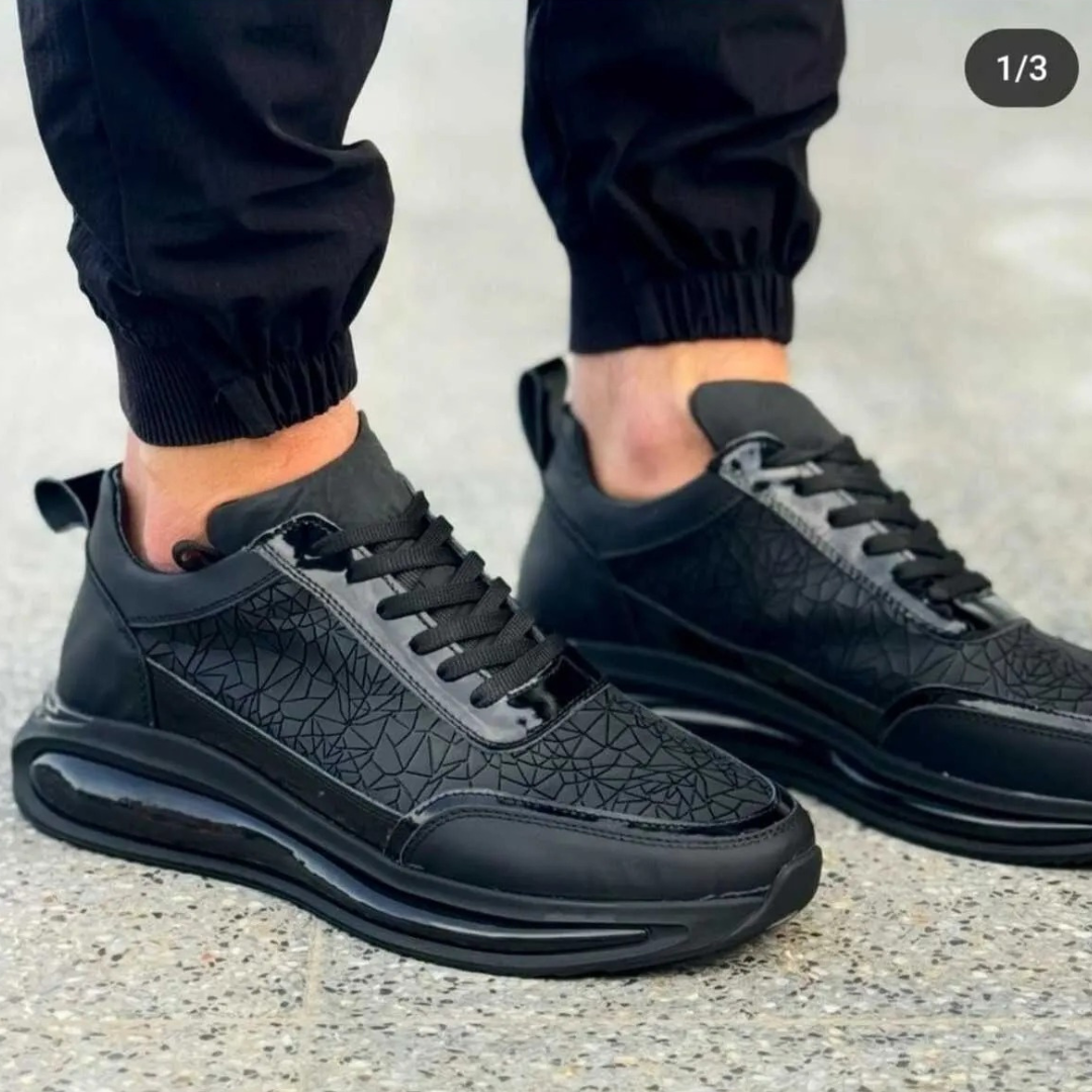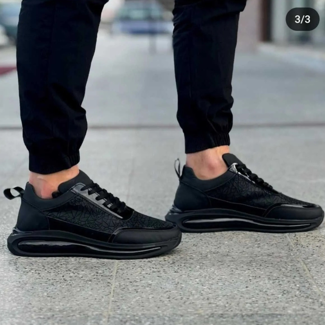 Estes ténis em couro preto com sola da mesma cor são ideais para o homem moderno que procura um visual discreto, elegante e versátil. Um calçado pensado para o ritmo do dia a dia.