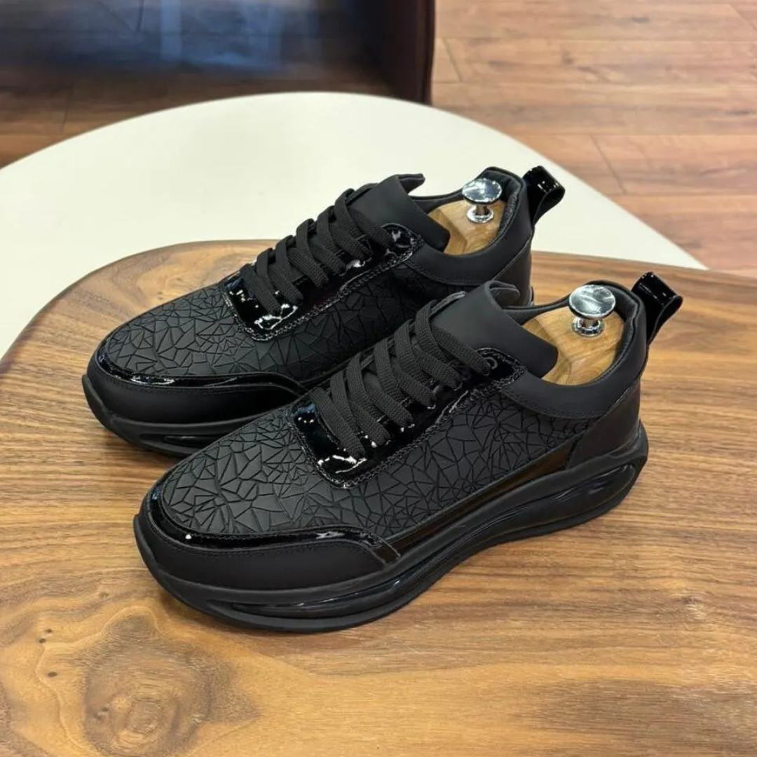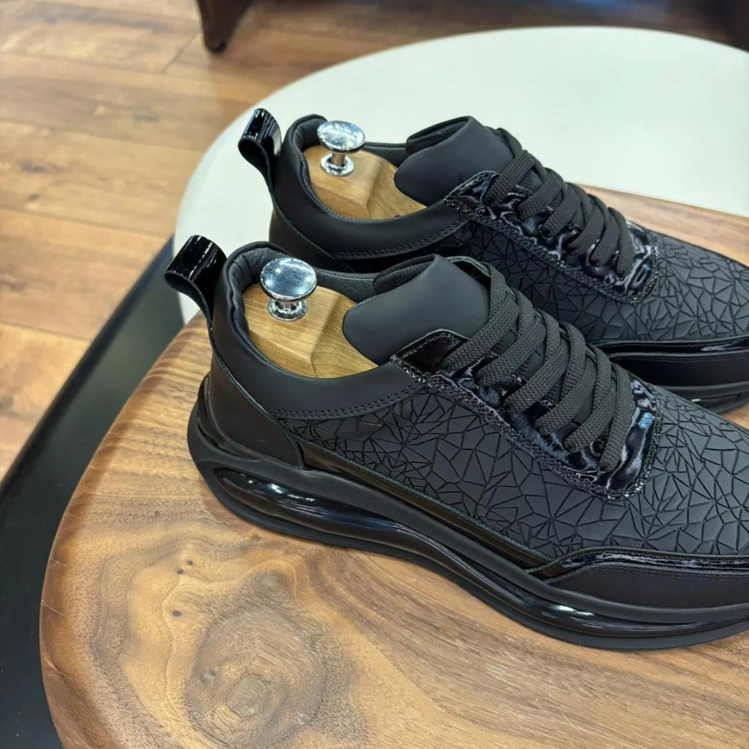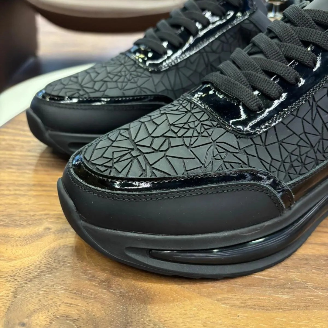 Estes ténis em couro preto com sola da mesma cor são ideais para o homem moderno que procura um visual discreto, elegante e versátil. Um calçado pensado para o ritmo do dia a dia.