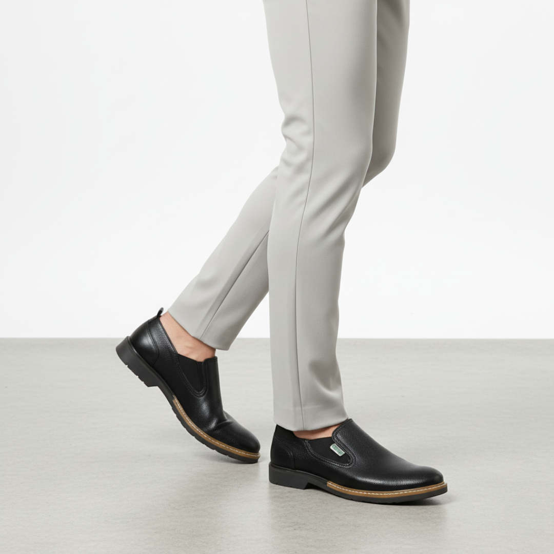 O design sem atacadores, com painéis elásticos nas laterais, permite calçar e descalçar os sapatos de forma rápida e fácil. Esta característica, juntamente com a sola resistente e o design de costura visível, combina funcionalidade com um estilo moderno, garantindo um calçado confortável e fiável para o dia a dia.