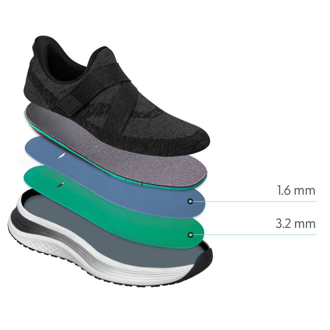 A biqueira larga e o interior sem costuras garantem mais espaço para os dedos e evitam fricções, tornando estes ténis ideais para quem sofre de joanetes, fascite plantar ou diabetes.